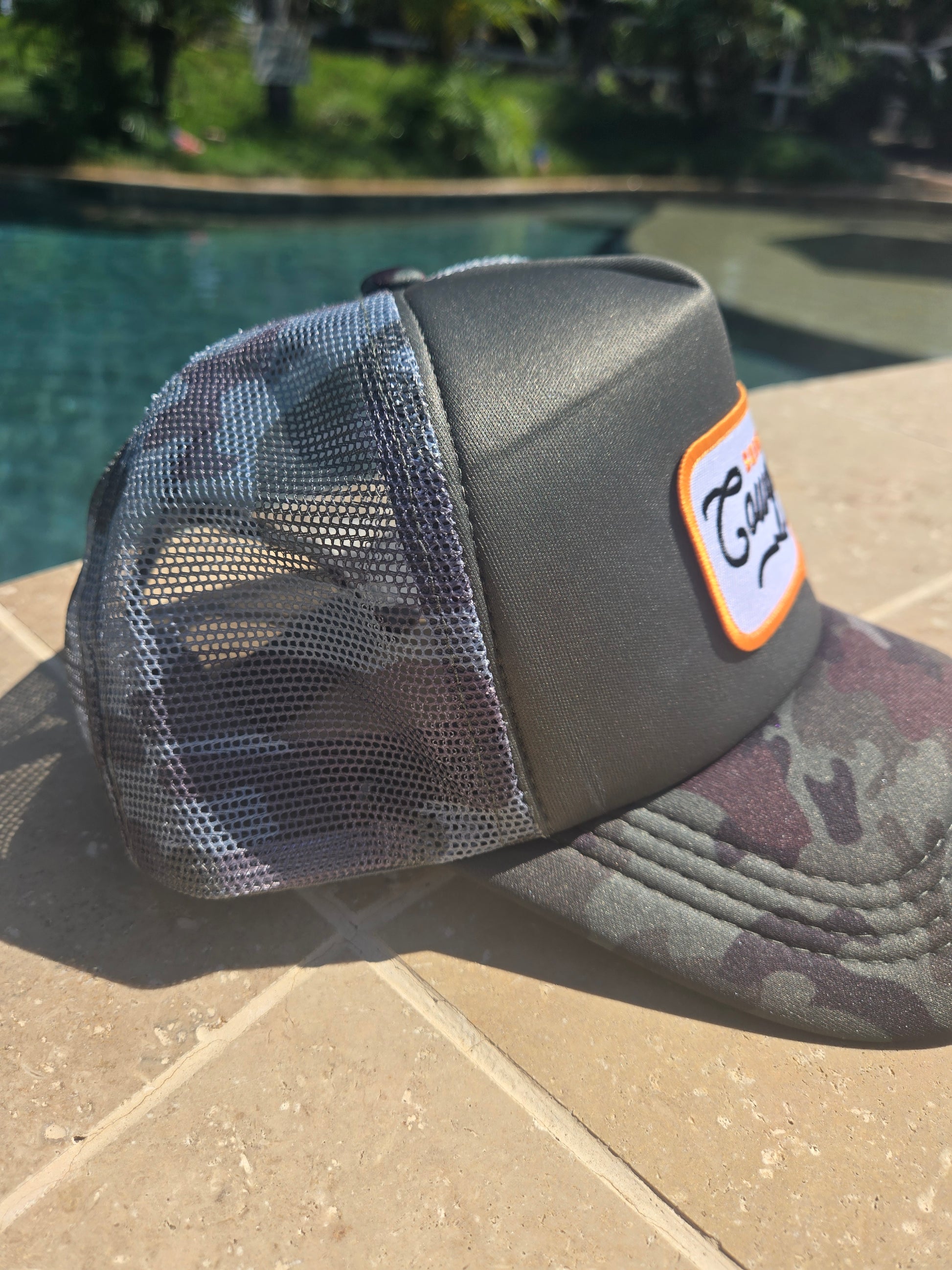 Combine classic Western style with rugged outdoor practicality in the Surfs Up Cowgirl Camo Trucker Hat. This adjustable hat features a durable camo pattern and a distinctive patch that reads "surfs up cowgirl," perfect for cowgirls who embrace both surf and saddle. Its breathable mesh back ensures comfort during active days, while the secure fit adapts easily to your size. Ideal for outdoor adventures, this hat offers both style and function for confident wear.