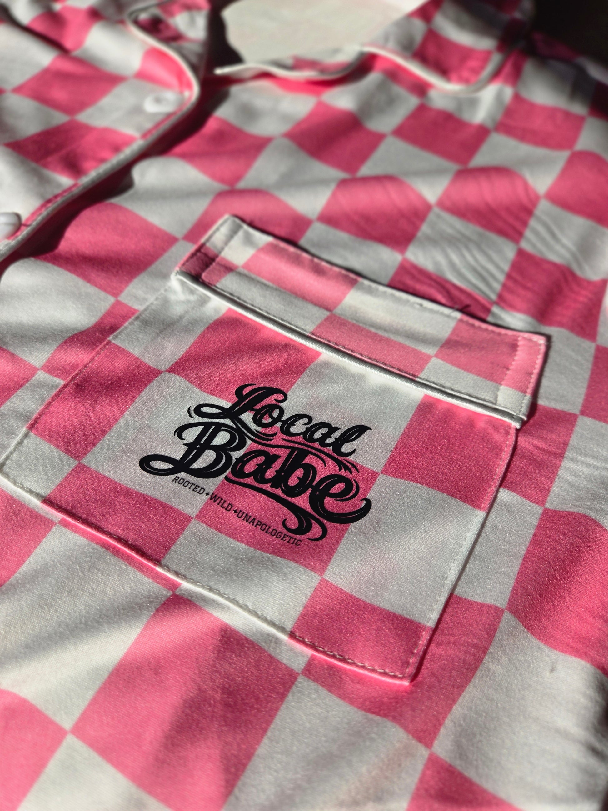 Silky, buttery-soft stretch fabric Lightweight and breathable Relaxed button-up top with pocket logo, Elastic waist shorts/pants for comfy fit, Signature Local Babe pink checker print
