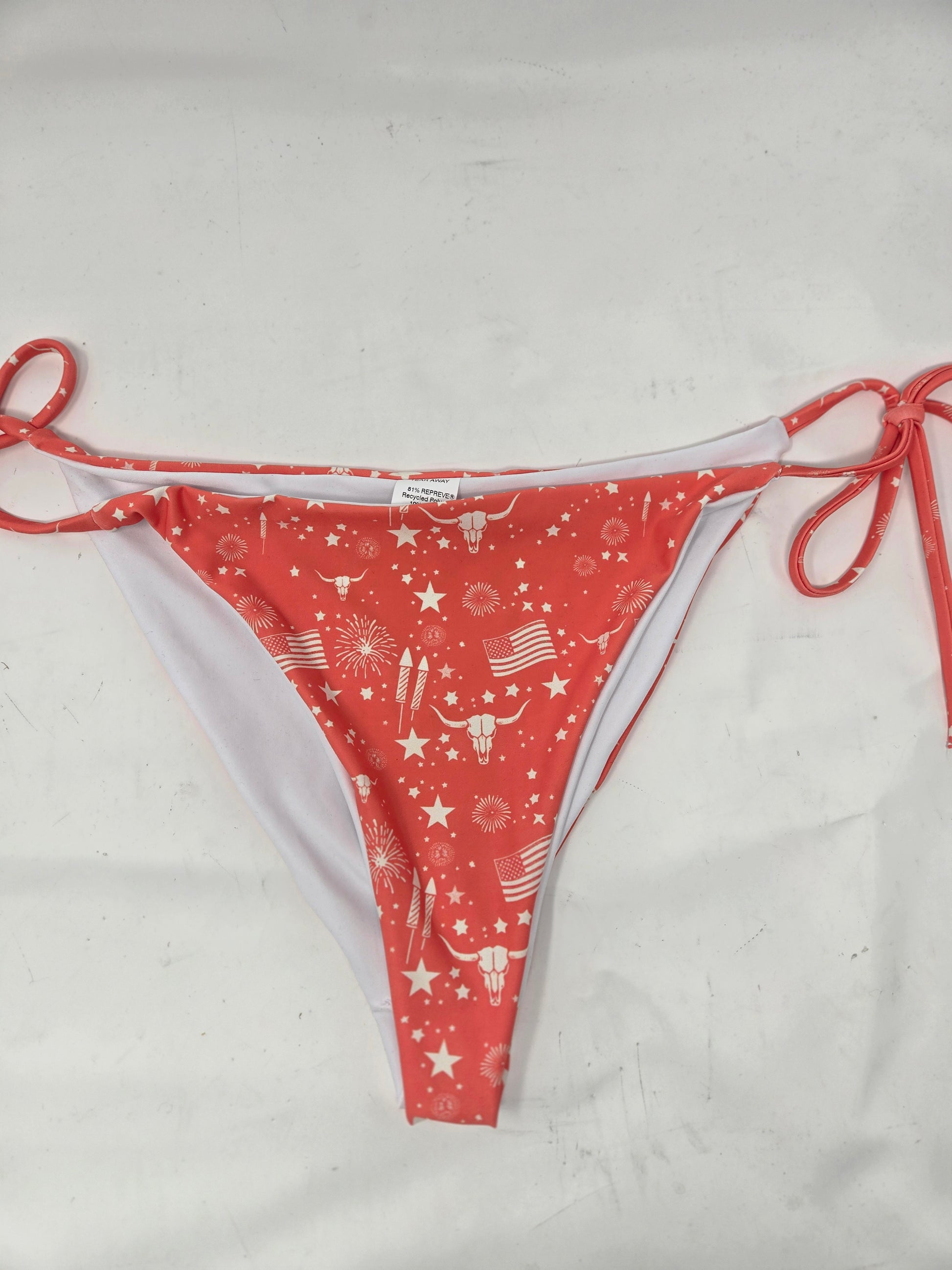 Let freedom ring in these butter-soft tie-side bikini bottoms featuring a bold American print. Designed for comfort and confidence, these bottoms deliver a flattering fit with adjustable tie sides for the perfect custom fit. Whether you're poolside or beach-bound, rock patriotic style with a playful edge. Soft fabric keeps you comfy all day long.