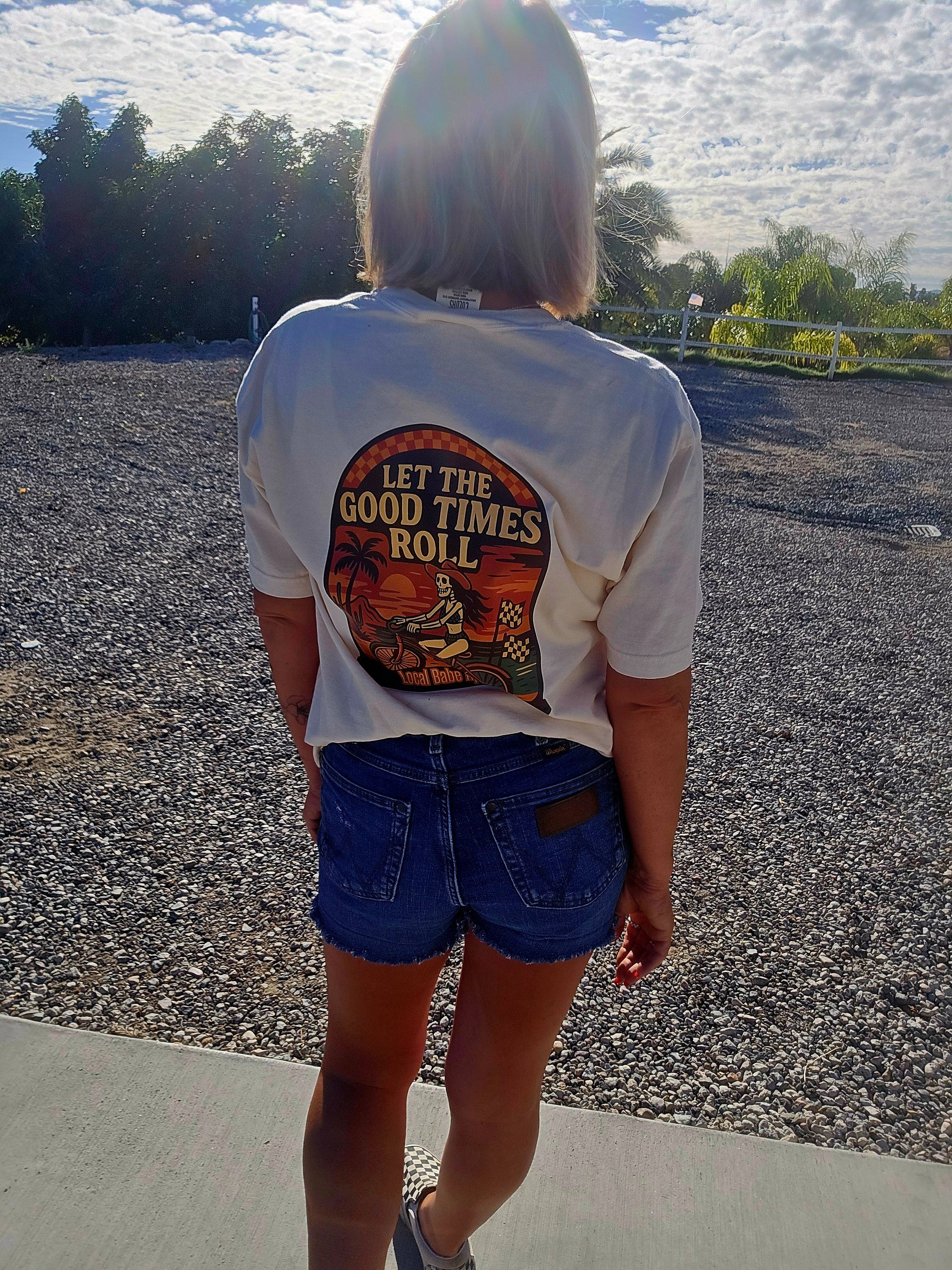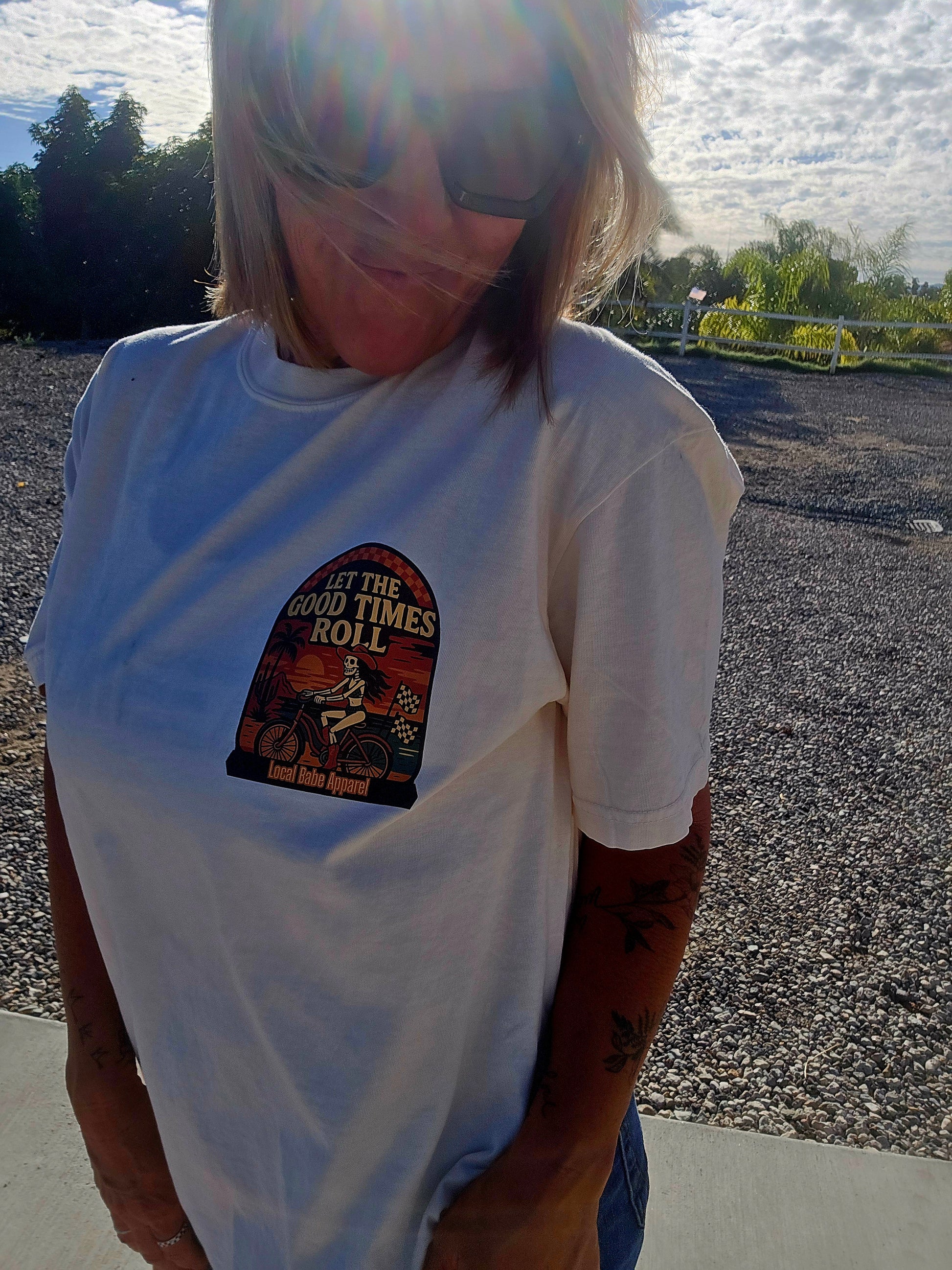 Ride into desert vibes with this bold graphic tee featuring a skeleton babe cruising on her bike in a checker-print bikini against a sunset backdrop. With cacti, wide-open skies, and the slogan “Let the Good Times Roll”, this design celebrates freedom, fun, and living life wild. Perfect for beach days, desert rides, or just kicking back in style, this tee is made for babes who chase adventure and good times everywhere they go.