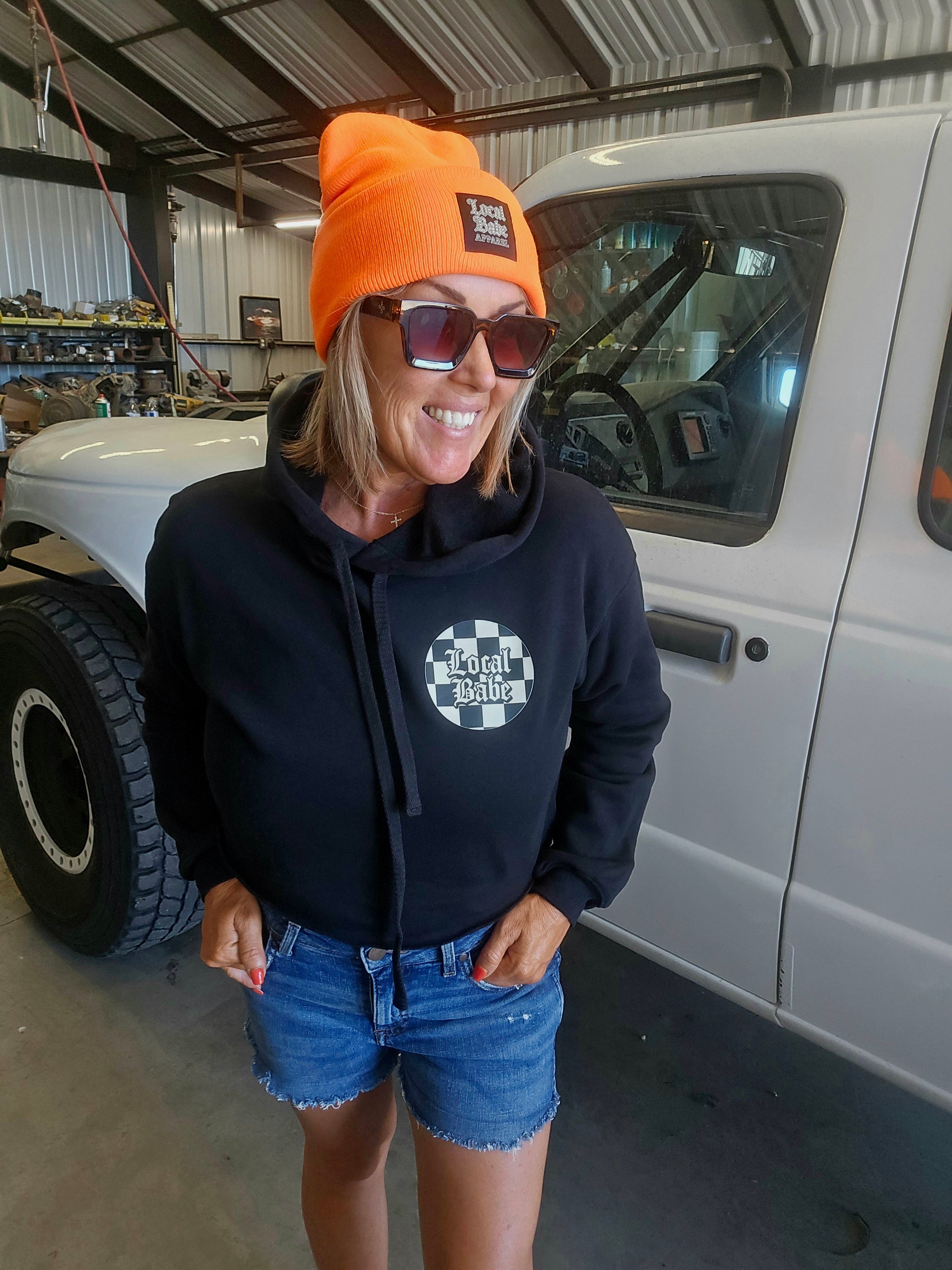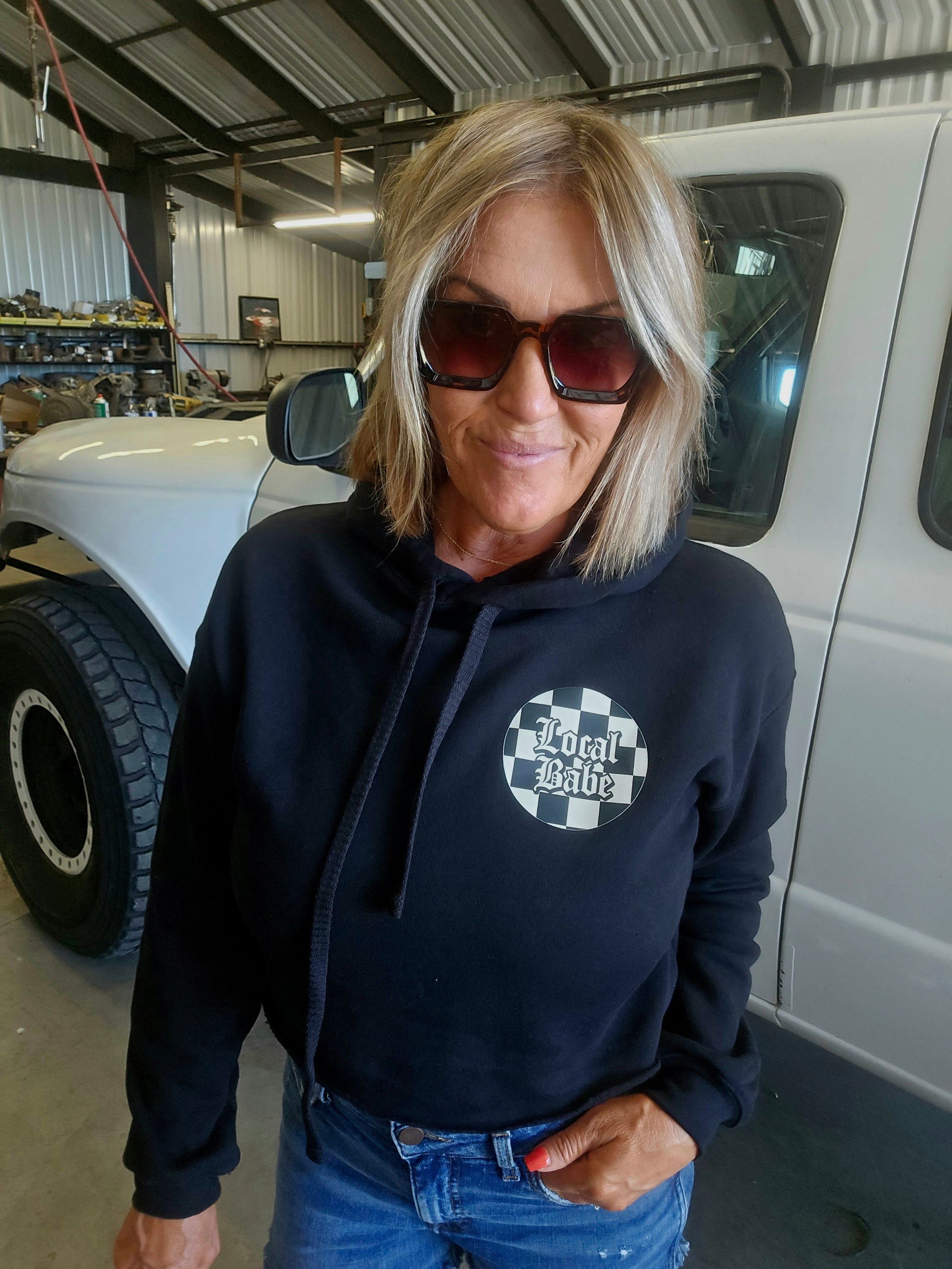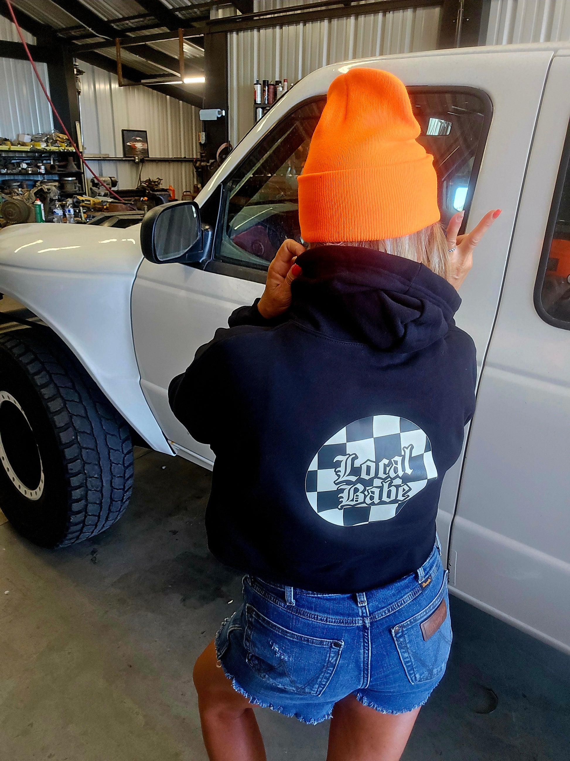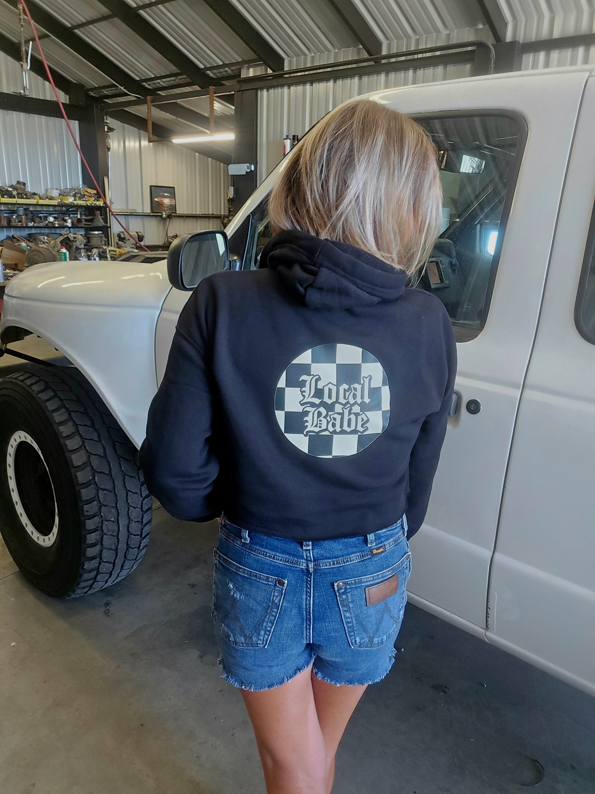 This cropped fleece hoodie is made for the girls who live for garage hangs, desert drives, and good vibes only. Featuring our signature checkered circle logo with Local Babe in vintage Western font, it’s the perfect mix of edgy and effortless.